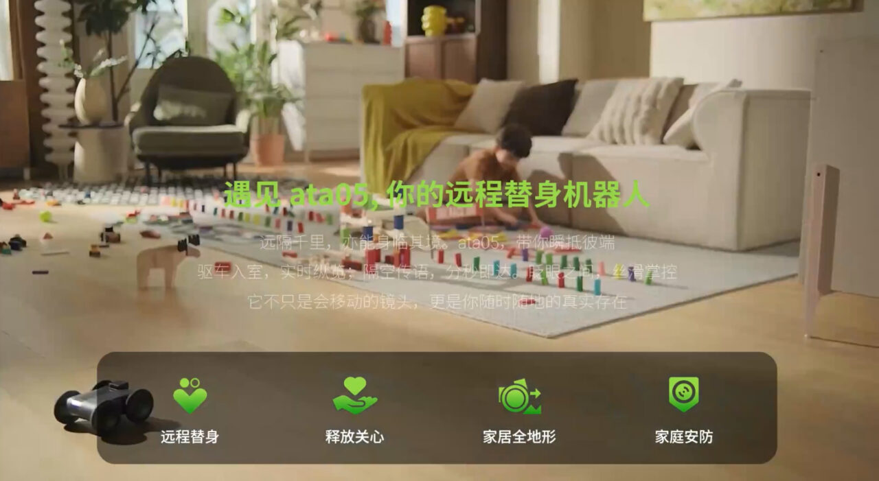 “ata05”旨在让用户通过手机App和网络,以第一视角实时进入机器人所在空间,实现远程交流、观察、移动与互动,成为用户可随时上线的“远程分身”。