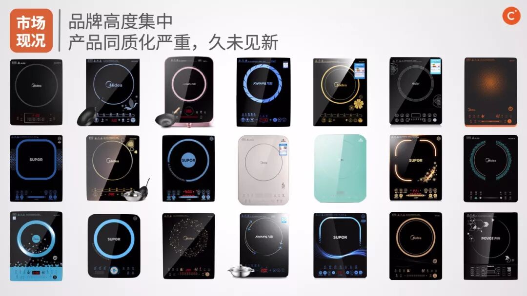 但市场部的人就说不行,他们说整个电磁炉市场的大半江山被美的、苏泊尔、九阳给占领了。那时候电磁炉长成什么样?就长成这个样子(上图),如果挡住LOGO,大家分不出它们属于哪个品牌,这就是当时电磁炉市场的现状。